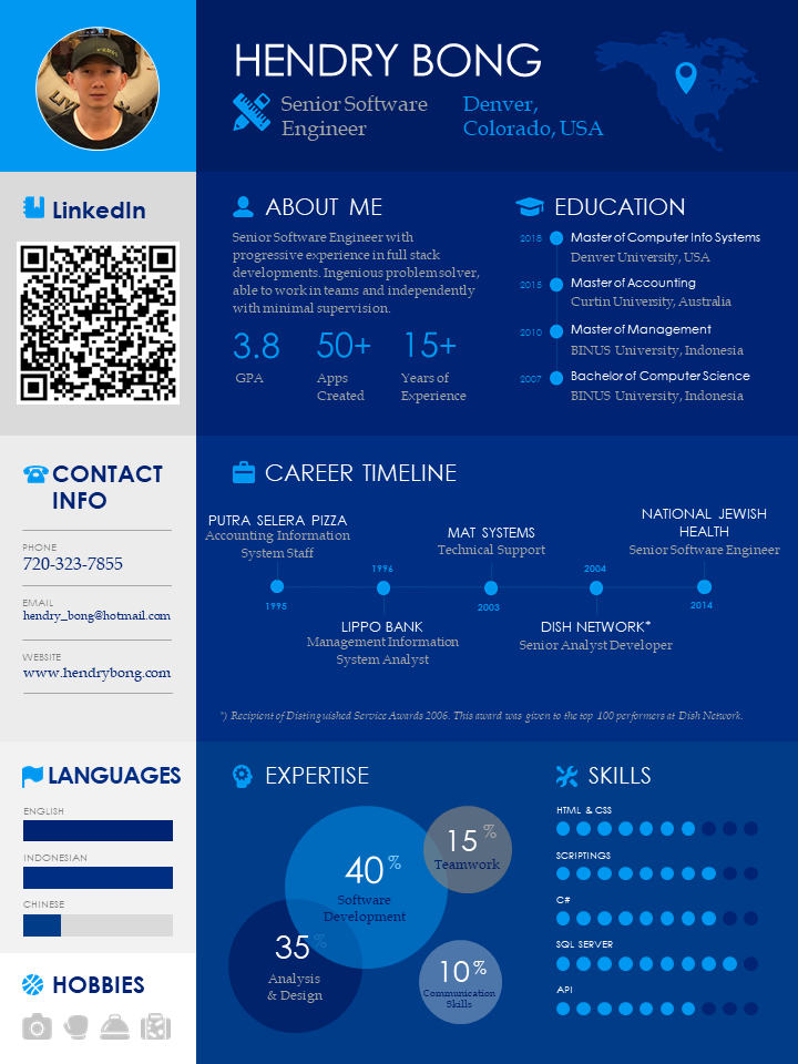 Senior Software Engineer with over 15 years of hands-on experience, I have worked in several technologies including web applications, web APIs, Windows services, ETLs/batch jobs, and databases. I am also a Team Lead in my current position. I earned 3 Master's degrees in Computer Information Systems, Accounting, and Management. Please see my classic résumé or infographic résumé for more details.